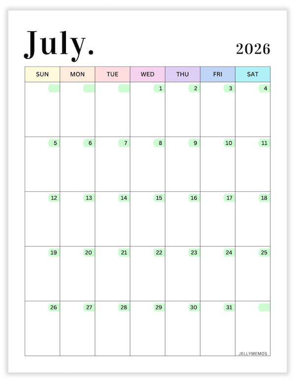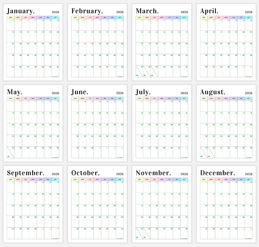 2026 Pastel Calendar Printables (Vertical)
