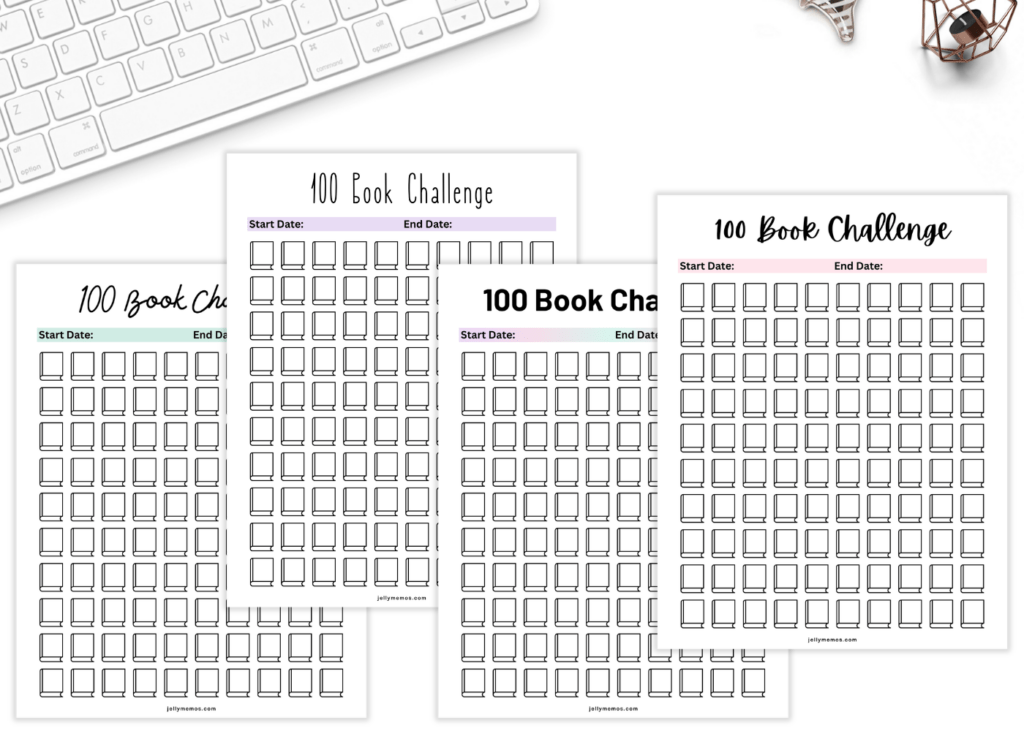I’ve created 12 cute 100 book challenge templates to choose from. There are cute and colorful designs plus a couple of minimal, ink-friendly designs. Here’s a preview of the challenge templates: